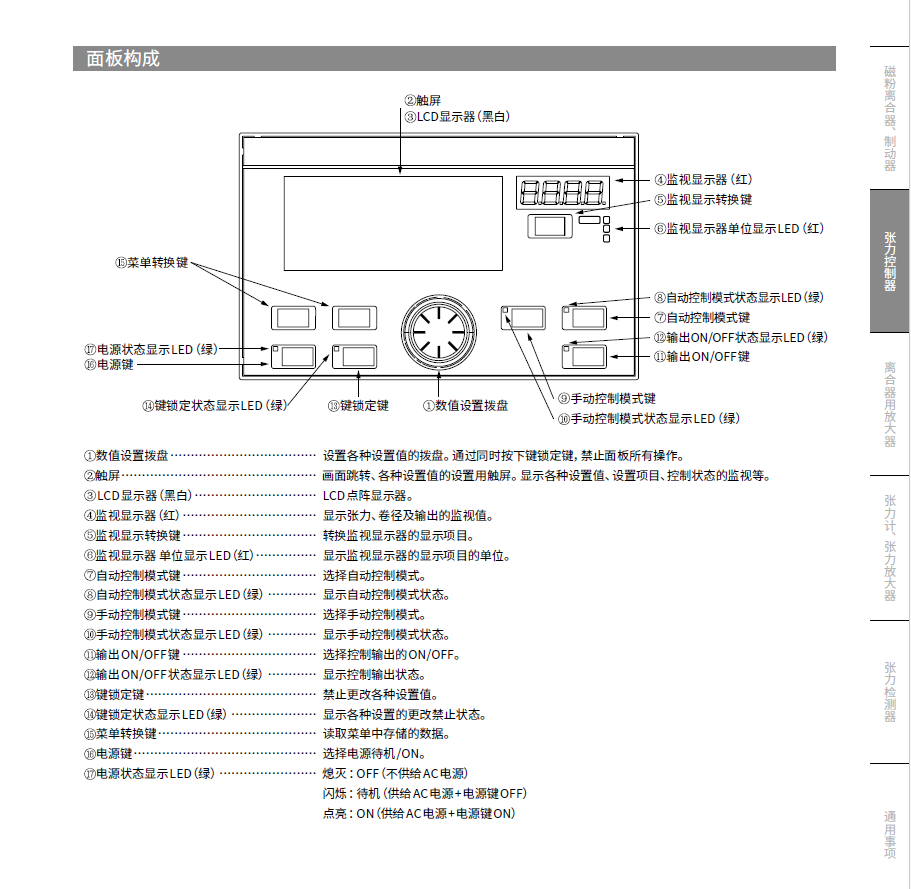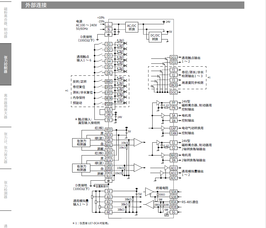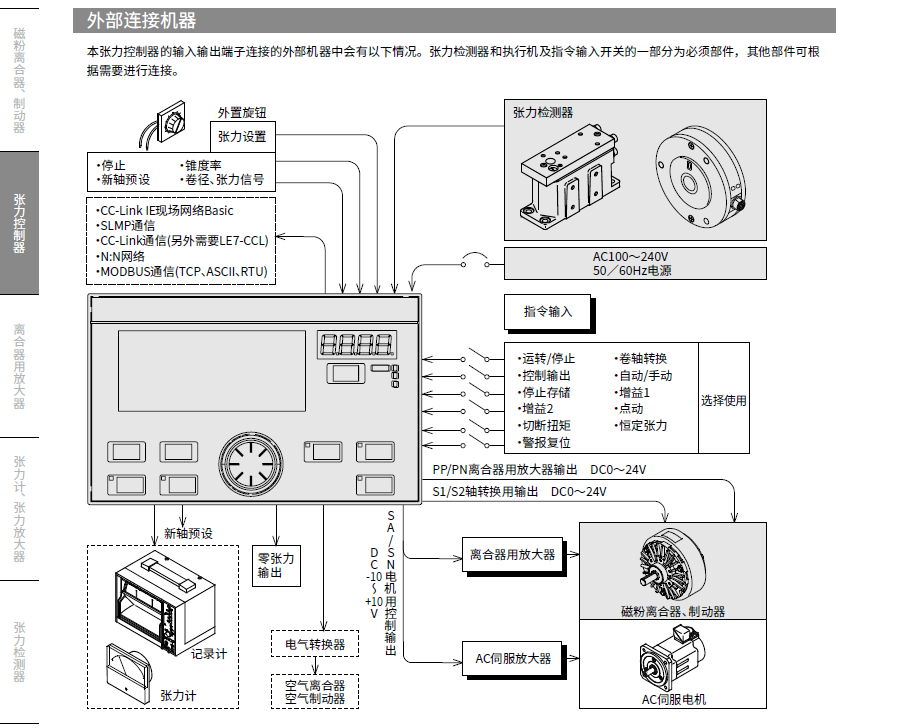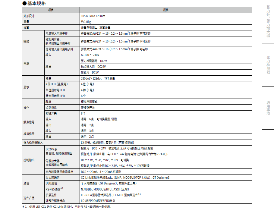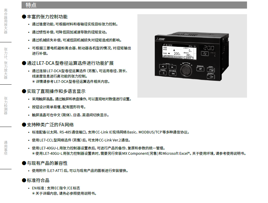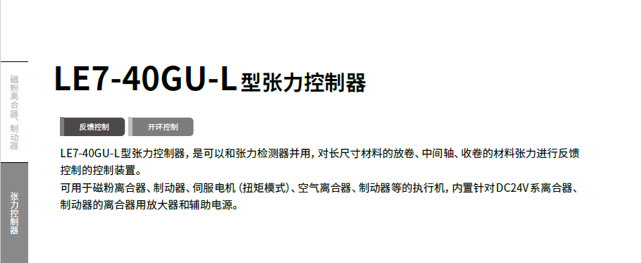 LE7-40GU-L型張力控制器,是可以和LX7-F/LX-TD型張力檢測器并用,對長尺寸材料的放卷、中間軸、收卷的材料張力進(jìn)行自動控制的控制裝置。可用于磁粉離合器/制動器、伺服電機(jī)(扭矩模式)、空氣離合器/制動器等的執(zhí)行機(jī),內(nèi)置針對DC24V系離合器/制動器的離合器用放大器和輔助電源。此外,使用LE7-DCA型卷徑計(jì)算選件,還可進(jìn)行前饋/反饋復(fù)合控制和開環(huán)制。